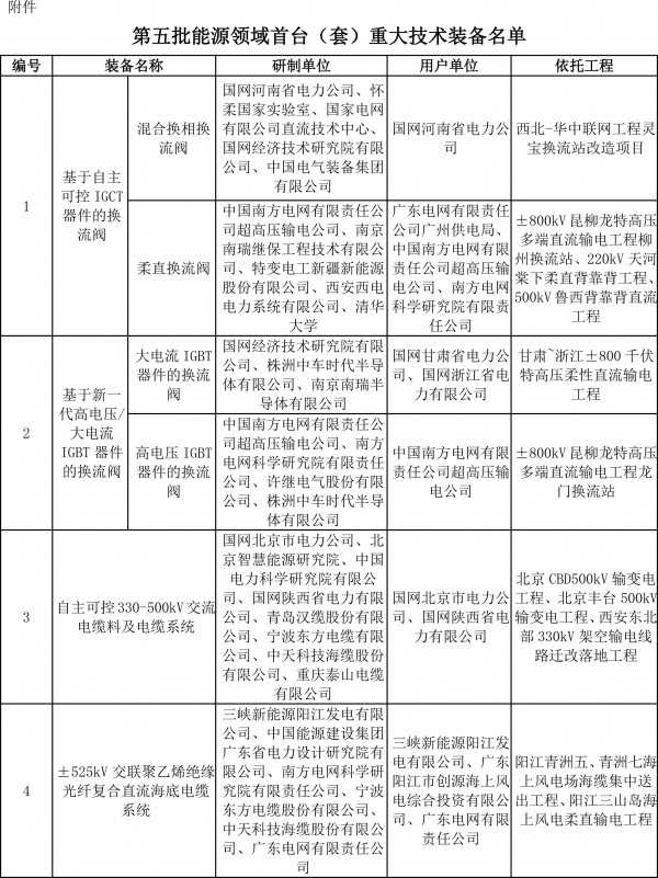 一、根據各有關單位申請,經組織專家評審和公示,決定將“基于自主可控IGCT器件的換流閥”等82項技術裝備列為第五批能源領域首臺(套)重大技術裝備。各有關單位要抓緊推動技術裝備研制,扎實依托工程開展應用。