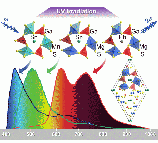 在上述工作的基礎上,科研人員利用該家族化合物中八面體及四面體組成的風車狀陰離子框架的孔道限閾效應,在AI0.5BII3CIII3QVI8家族合成出11例新的化合物,實現了該家族化合物帶隙、二階非線性光學效應及熒光性能的有效調控。其中,Sn0.5Mg3Ga3S8具備發光和非線性光學響應的雙重功能特性。實驗和計算結果表明,Sn0.5Mg3Ga3S8中強的非線性光學效應,主要歸因于八面體及四面體基元協同組裝誘導的非線性活性基元([SnIIS6]、 [GaS4])的有序排列。此外,該風車狀框架結構表現出的基元可替代性,主要歸因于結構中共點及共線的連接模式,而該結構的穩定性則主要來自于框架中共存的共面連接模式。